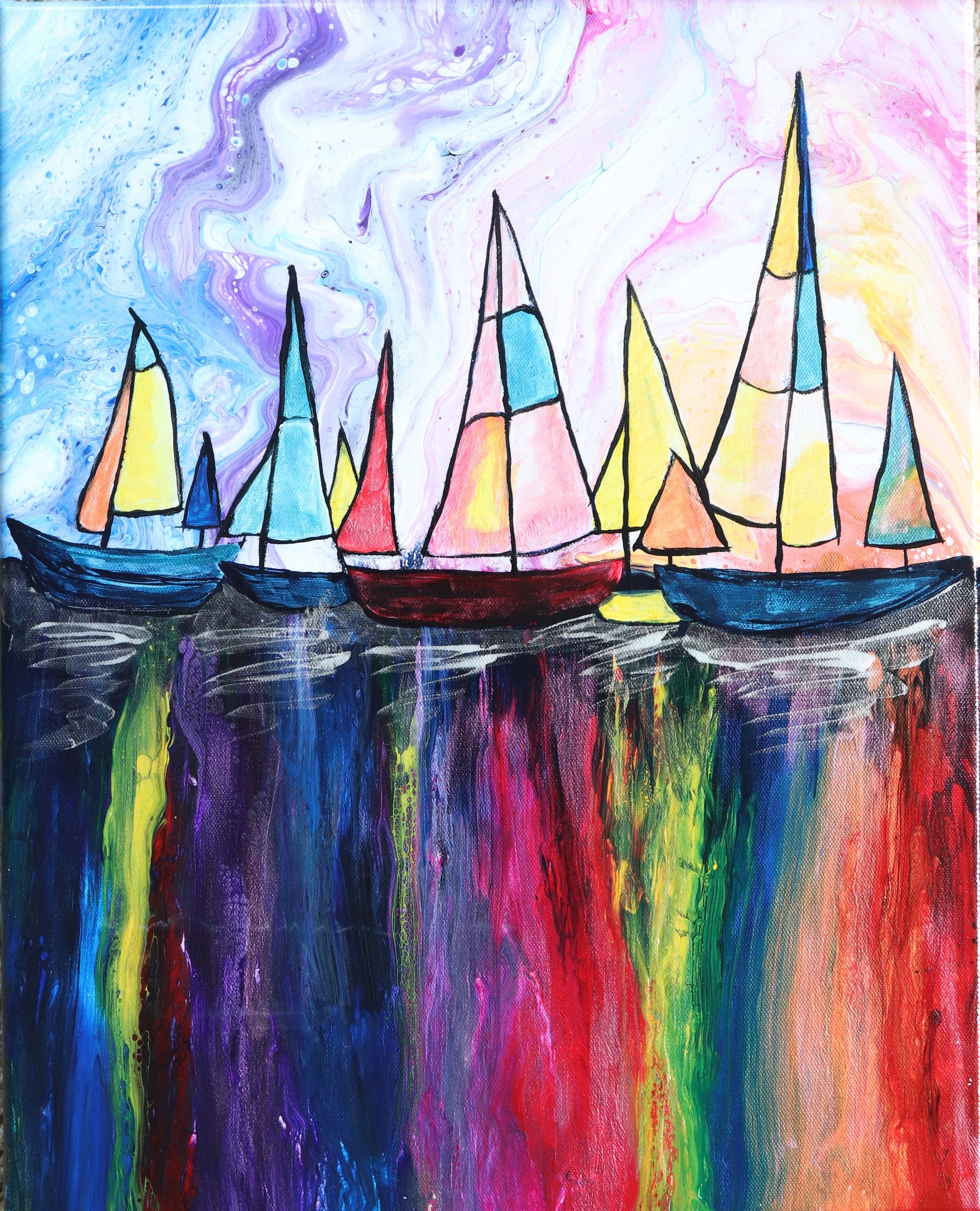 Our paintings are unique original art. They are created using a variety of fluid art techniques. We tend to use pigments in our work. Because the pigments give the paintings a lot of depth and movement that you can’t see in a photograph, we believe our work shows better in person than over the internet.