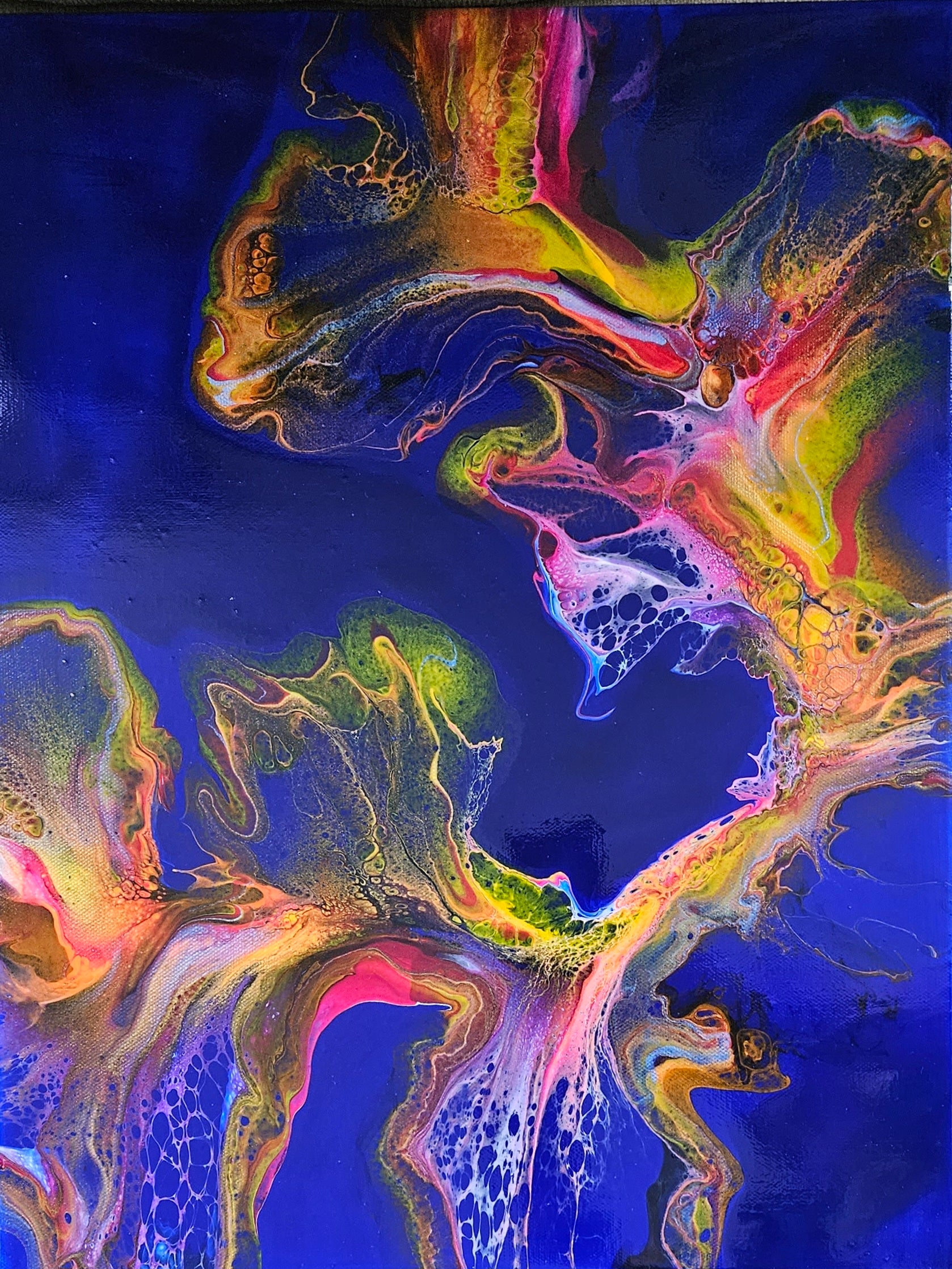 Our paintings are unique original art. They are created using a variety of fluid art techniques. We tend to use pigments in our work. Because the pigments give the paintings a lot of depth and movement that you can’t see in a photograph, we believe our work shows better in person than over the internet.
