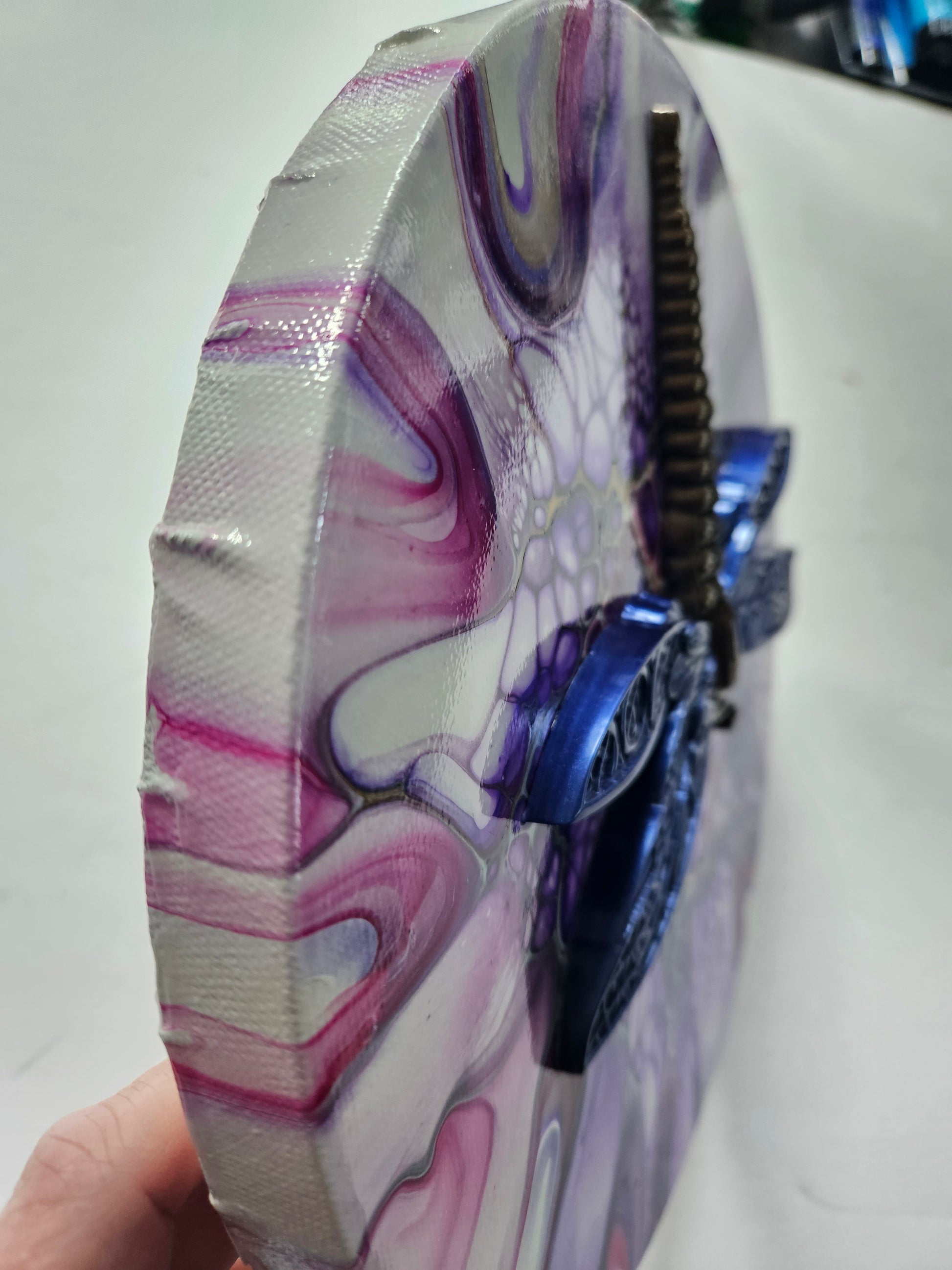 Our paintings are unique original art. They are created using a variety of fluid art techniques. We tend to use pigments in our work. Because the pigments give the paintings a lot of depth and movement that you can’t see in a photograph, we believe our work shows better in person than over the internet.